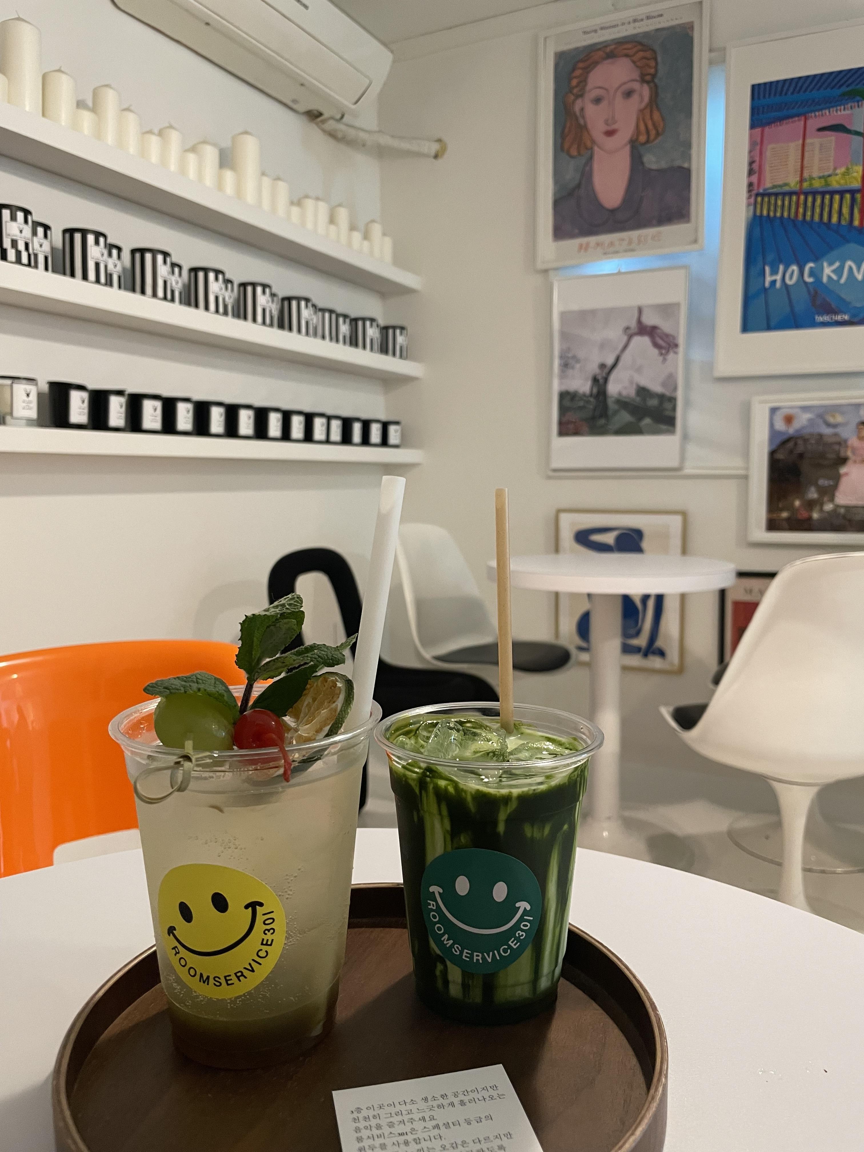 넓은 유리창 사이로 산책로를 내려다볼 수 있는 음료와 디저트가 맛있는 "룸서비스 301"입니다.