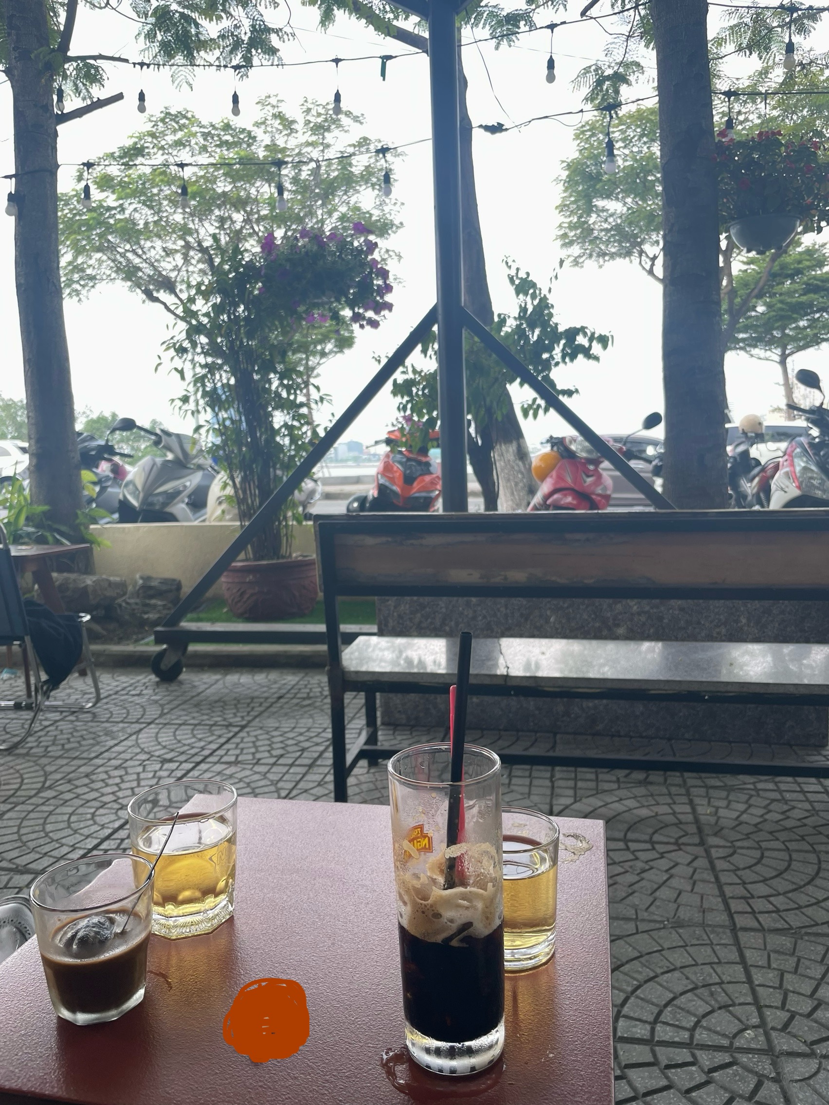 머나먼 도전을 하자며!! 저 용이 있는 다리를 건너서 가보자고 했습니다. 그게 잘못되었던 거 같아요. 그램을 탔어야 했어요. 갑자기 후덕 지근하더니 비가 내리고 그치면서 해가 너무 쨍해서 땀이 나기 시작하면서 끈적끈적거리기 시작했죠. 더위와 목마름으로 지쳐 갈 때쯤 현지인들이 많은 길거리 카페에서 커피를 시켰는데 이름 모르는 티와 함께 나오더라고요.