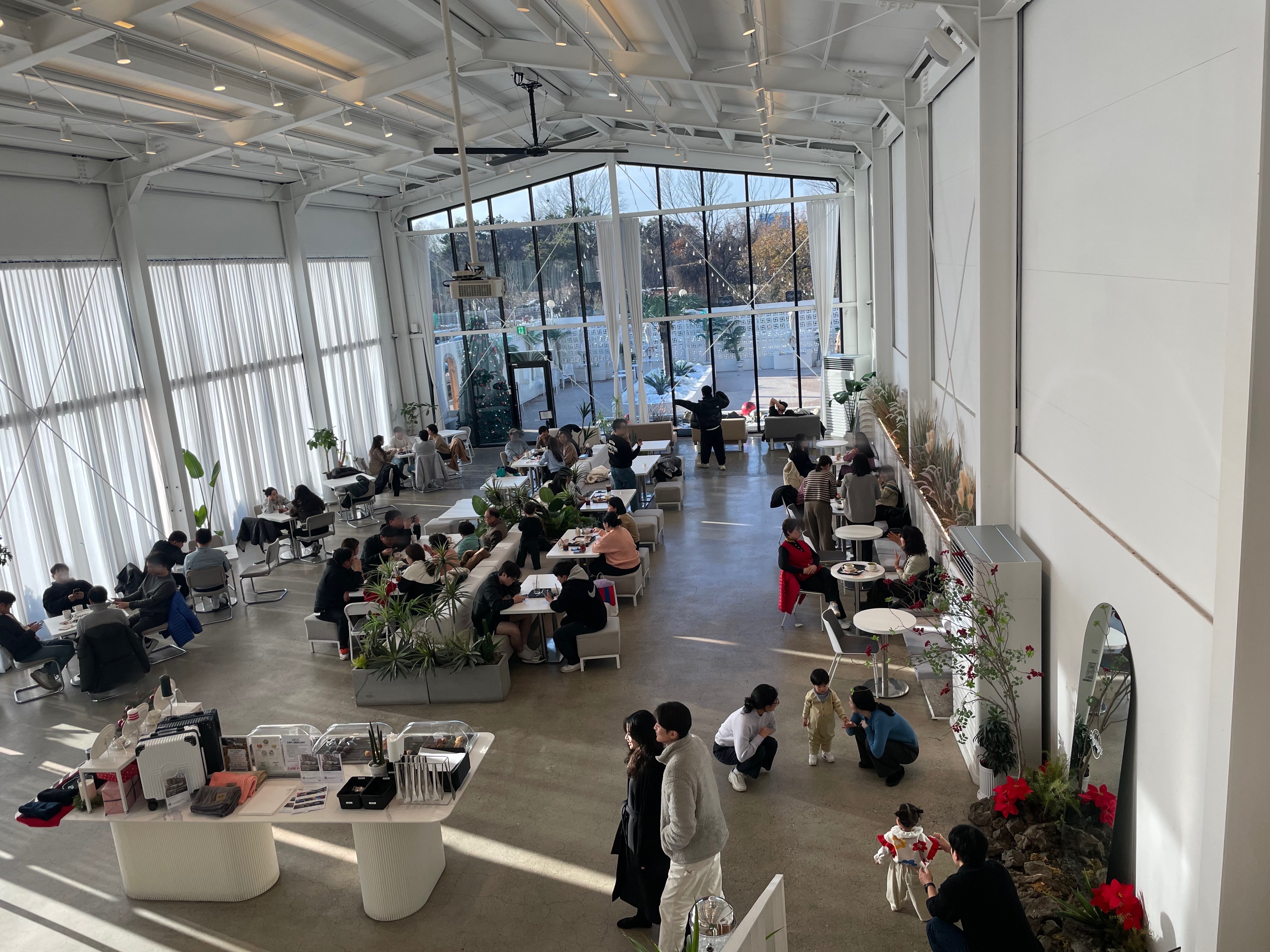 실내 인테리어는 1층부터 2층까지의 큰 통창으로 실내가 넓어 보이는 효과가 있어요. 그리고 2층은 노키즈존으로 되어있었어요. 화이트계열로 되어있어서 넓어 보여서 저는 깔끔해 보여서 좋더라고요. 그리고 나름의 포토존으로 몇몇 곳을 만들어 놓았더라고요.